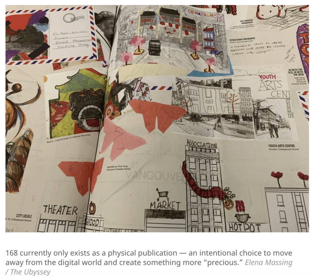 Check out the Ubyssey article by Elena Massing about the launch of ‘168,’ a youth-led magazine co-published by the Chinatown Storytelling Centre and re:Naissance Opera. It was an incredible experience working with the youth editorial team, advising artist/editor Blake Abbie, and the re:Naissance Opera team. I had the privilege of producing and facilitating the creative efforts!